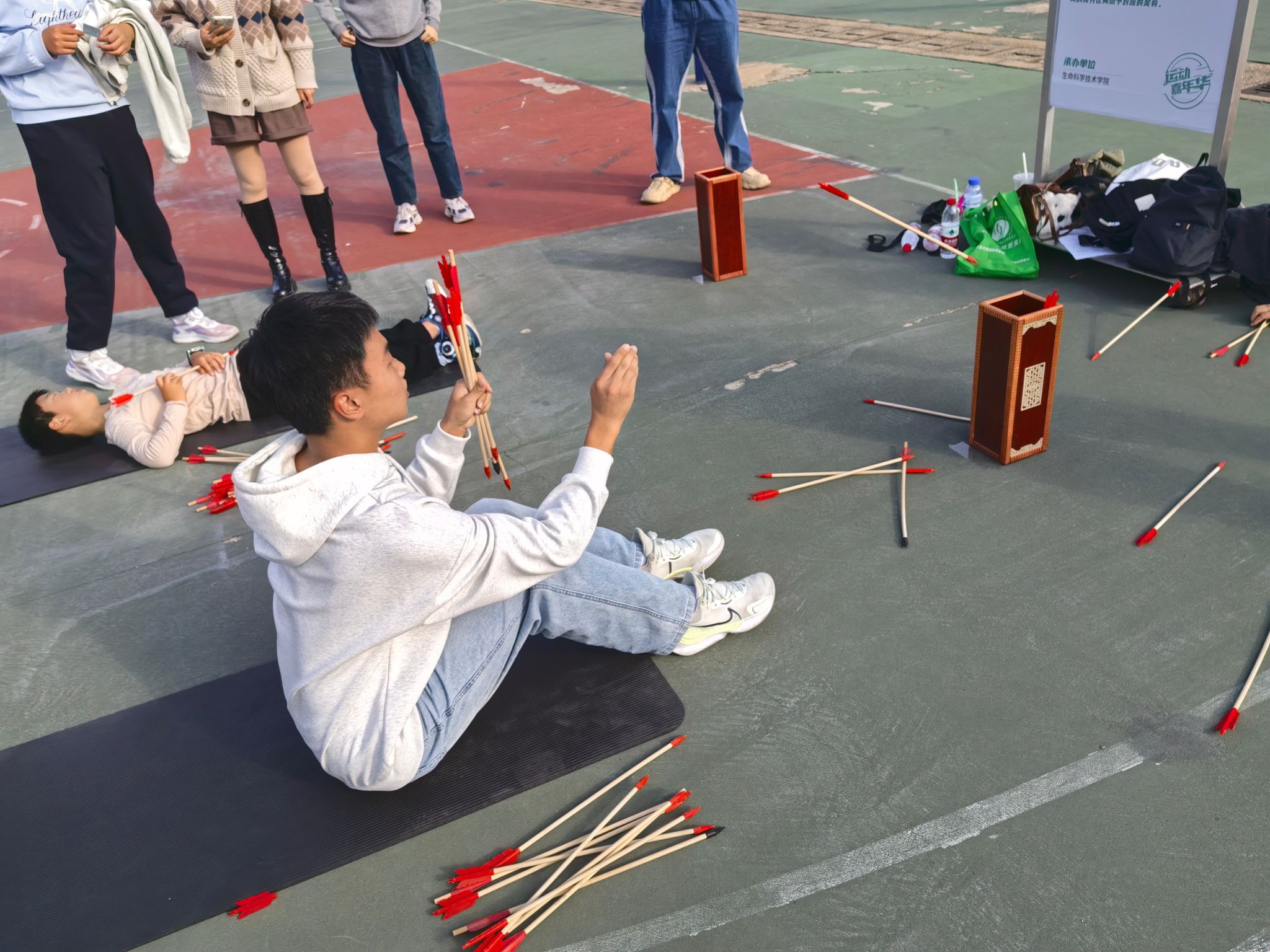 本届嘉年华挑战项目种类丰富,设有极速三子棋、指令大冒险、立定跳远与飞盘九宫格等,其中,生科院主办的仰卧投壶大作战在传统民俗基础上融入现代体能训练元素,在投壶基础上创新规则,挑战者需要在体操垫上进行仰卧起坐,并在仰卧起坐坐起时投壶。每完成一个仰卧起坐得1分,投壶投中一个羽箭得2分,比赛时间为1分钟。时间结束后由工作人员计算得分,按照不同得分区间给予对应奖券。