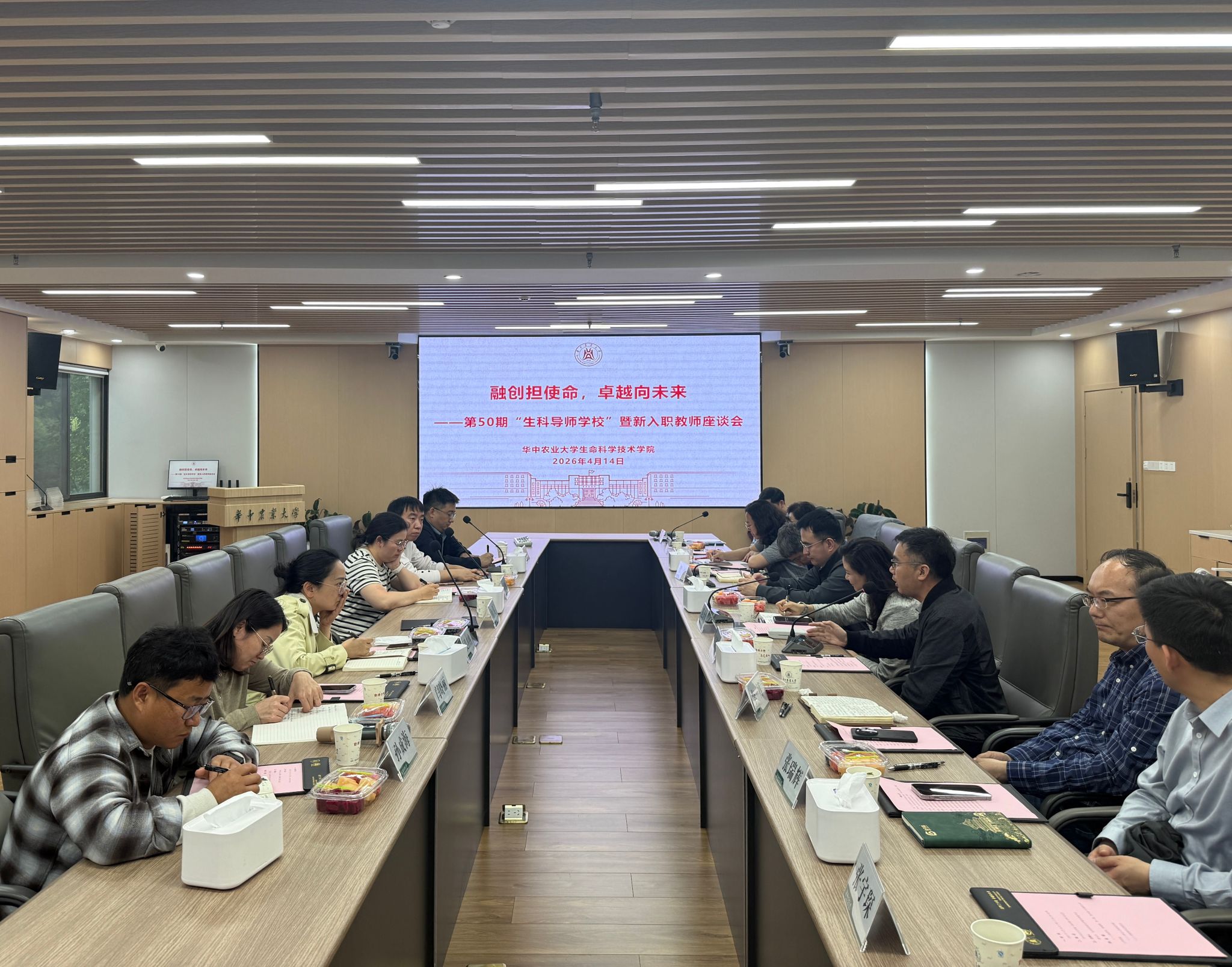 2026年4月14日,生命科学技术学院在第一综合楼A202会议室举办第50期“生科导师学校”暨新入职教师座谈会。活动以“融创担使命,卓越向未来”为主题,旨在帮助新教师快速融入学院、明晰发展路径,传承优良教风学风。学院党委书记范金凤、院长李兴旺等班子成员出席交流会,党委副书记唐永木主持会议,新入职教师及骨干教师代表齐聚一堂,展开经验传承与思想碰撞。