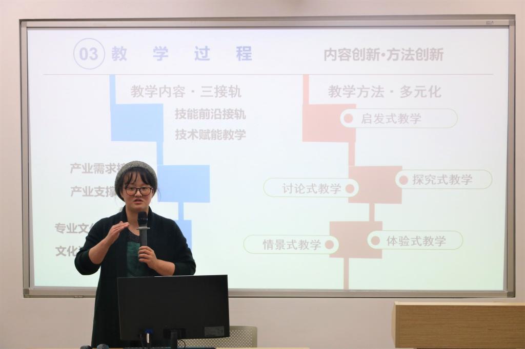 首先,王媛媛老师作为“教学质量一等奖”获得者分享自己的教学教改经验。王老师谈到,首先要明确教学目标,将“三全育人”、“五育并举”融入教学设计之中,从崇德、尚美、精艺三个维度着手,推进德育、美育以及专业方面的系统化学习。她介绍道,“希望系统化的课程让学生——发展健康个性,激发爱国热情;提升审美素养,提高文化素质;培养创新能力,构筑专业自信”,她的分享引起了老师们的共鸣,爆发热烈的掌声。