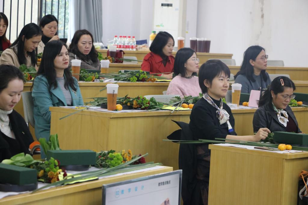 随后,王老师介绍了插花艺术的基本知识,引导大家用生活中常见的素材开展花艺创作,如柑橘、龙眼、蔬菜,小菊花、绿绒球以及校园内随处可见的其他植物等。老师们一边看着台上的演示,一边迫不及待地自己动手操作,大家用水烛的枝条制作层峦叠嶂的“山丘”,又将底座以锡纸包裹,做成平静的湖面,就如同华农美丽的校园,依山傍水之间,十分生动有趣。