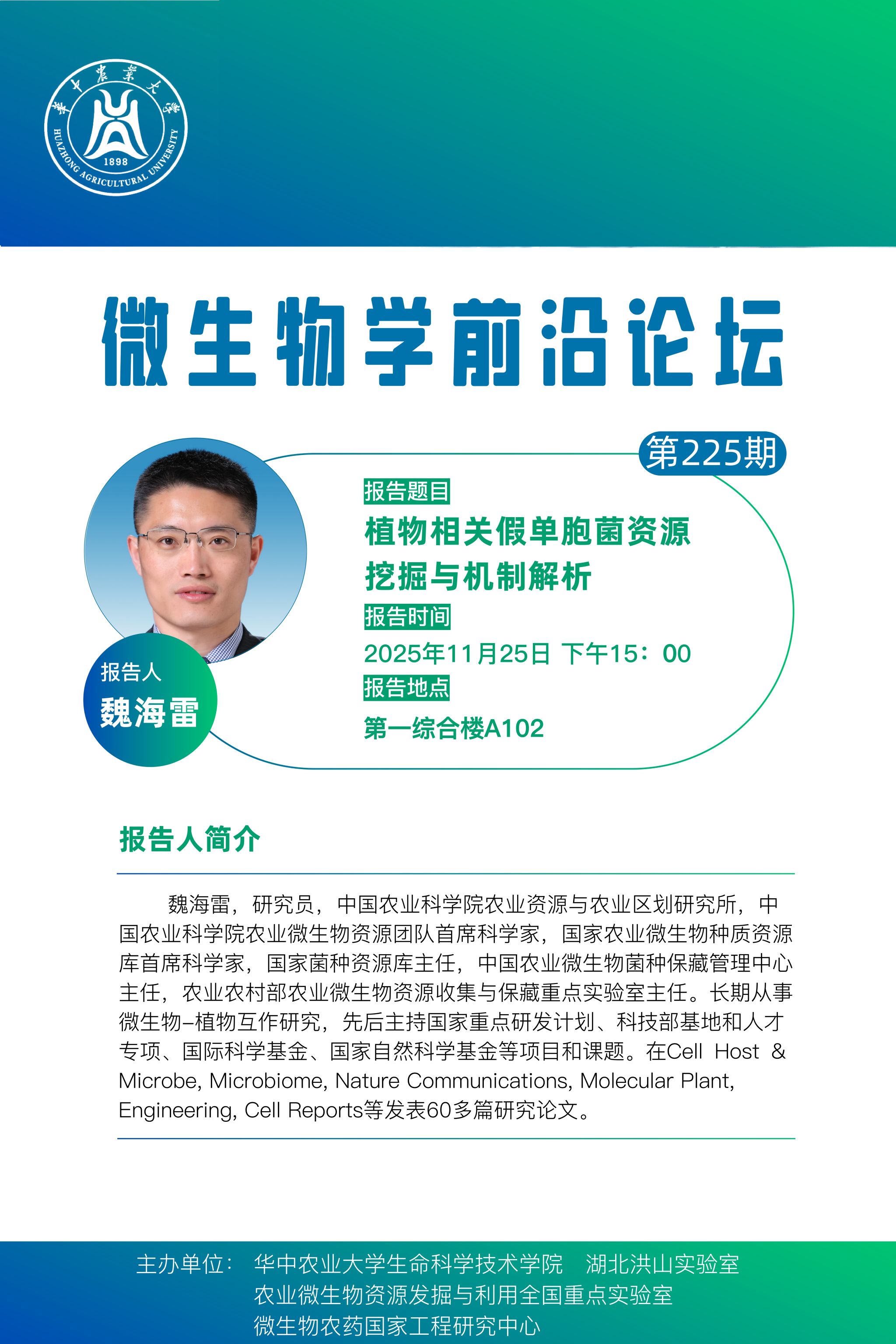 活动时间 2025年11月25日 15:00 报告题目 第225期微生物学前沿论坛
