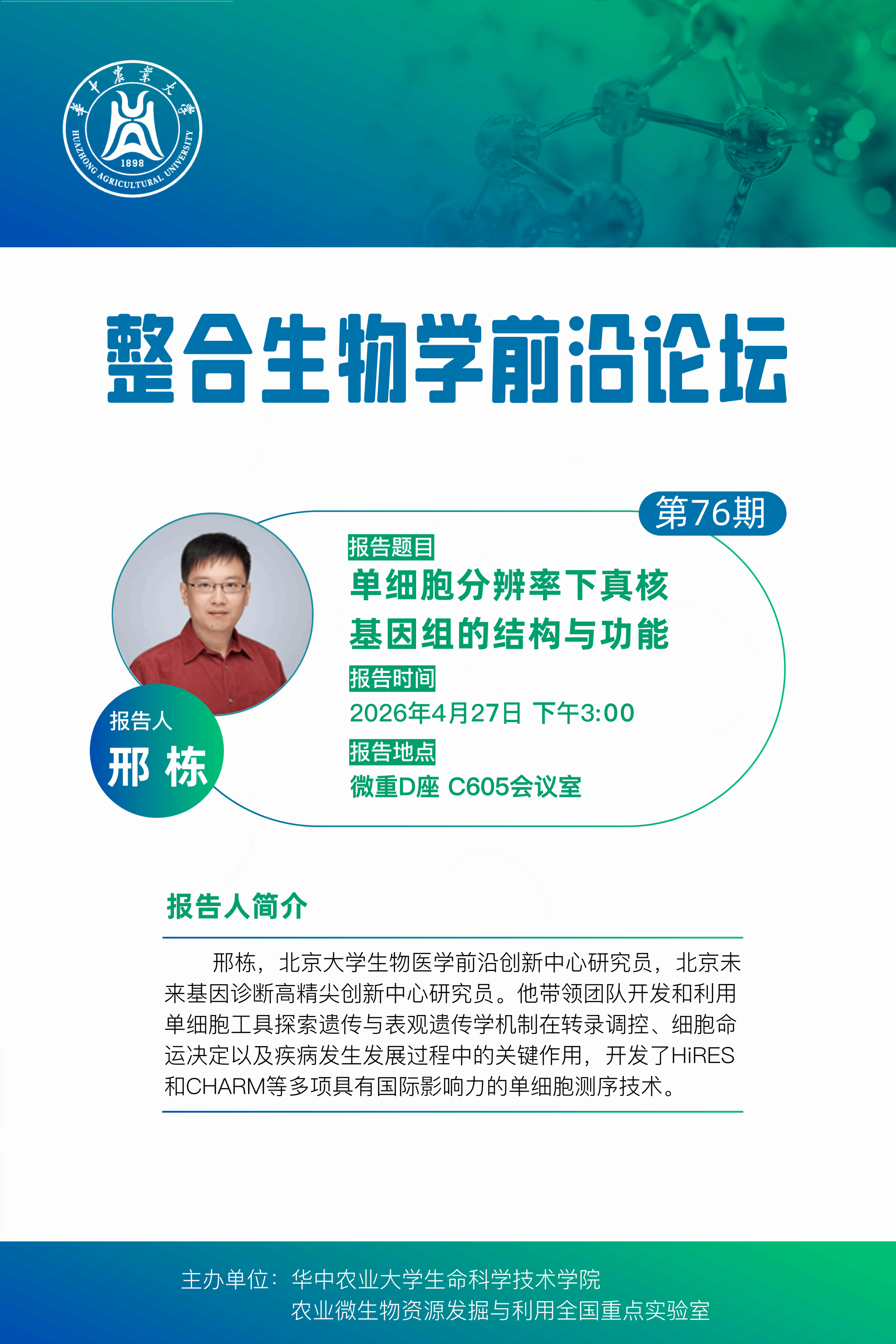 活动时间 2026年4月27日下午3:00 报告题目 第76期整合生物学前沿论坛