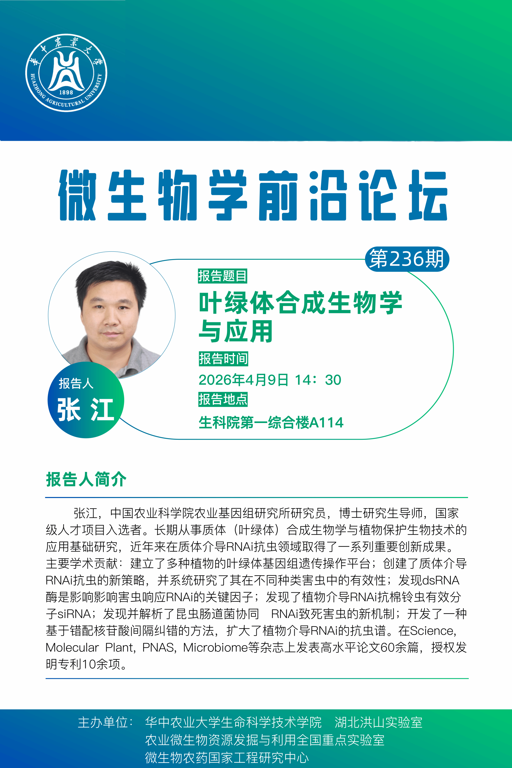 活动时间 2026年4月9日(周四)下午14:30 报告题目 第236期微生物学前沿论坛